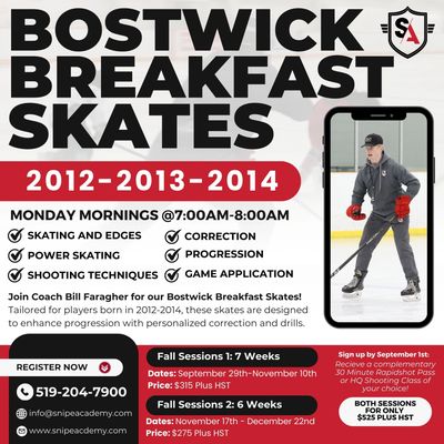 IMPORTANT: To register for both sessions, please use either the Session 1 or Session 2 sign-up link. At checkout, select “PI: 2012/13/14 Bostwick Breakfast Skates – Fall Session 1 & 2”