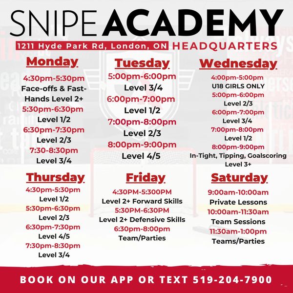 Gain access to a weekly shooting and skills class to refine your techniques, ensuring you enter the season at peak performance. Plus, you'll receive a Snipe Academy Training T-Shirt. Prepare to dominate on the ice – join today and make the upcoming season your best yet!
